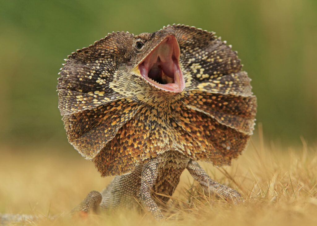 At rest, it looks like a fairly standard lizard. But when threatened, the frilled lizard fans out a giant, circular frill around its head, hisses, and bolts on its hind legs like a tiny dinosaur fleeing the scene. The transformation is so sudden and dramatic that most people laugh out loud the first time they see it. It’s equal parts intimidating and ridiculous, and definitely unforgettable.