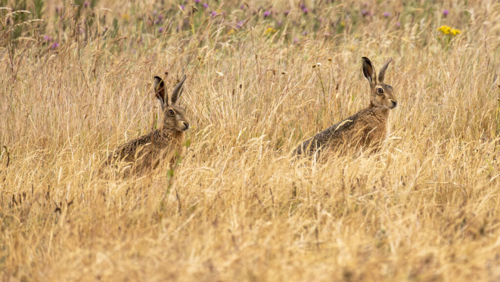 Brown hares are bigger than rabbits and can sprint like lightning when they need to, but most of the time, they rely on being unseen. Their sandy fur blends into dry fields, moorland, and overgrown grass, especially in spring and summer. They’ll lie low and flatten themselves against the ground rather than run. Unless you know exactly where to look, you might never spot one until it bolts right in front of you.