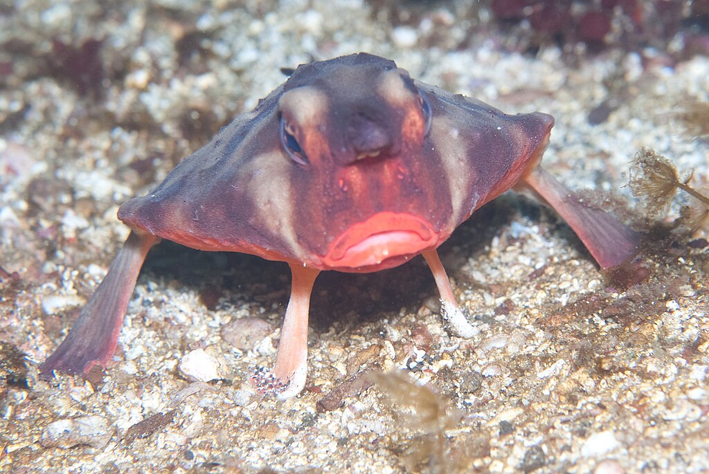 This fish looks like it’s wearing lipstick, and it can’t swim very well. Instead, it walks along the seabed on its stiff fins like little legs. The bright red mouth? That’s real, and no one really knows why it’s so vivid. Found around the Galápagos, it’s one of those animals that feels like a cartoon character brought to life. Strange, dramatic, and totally unbothered by its oddness.