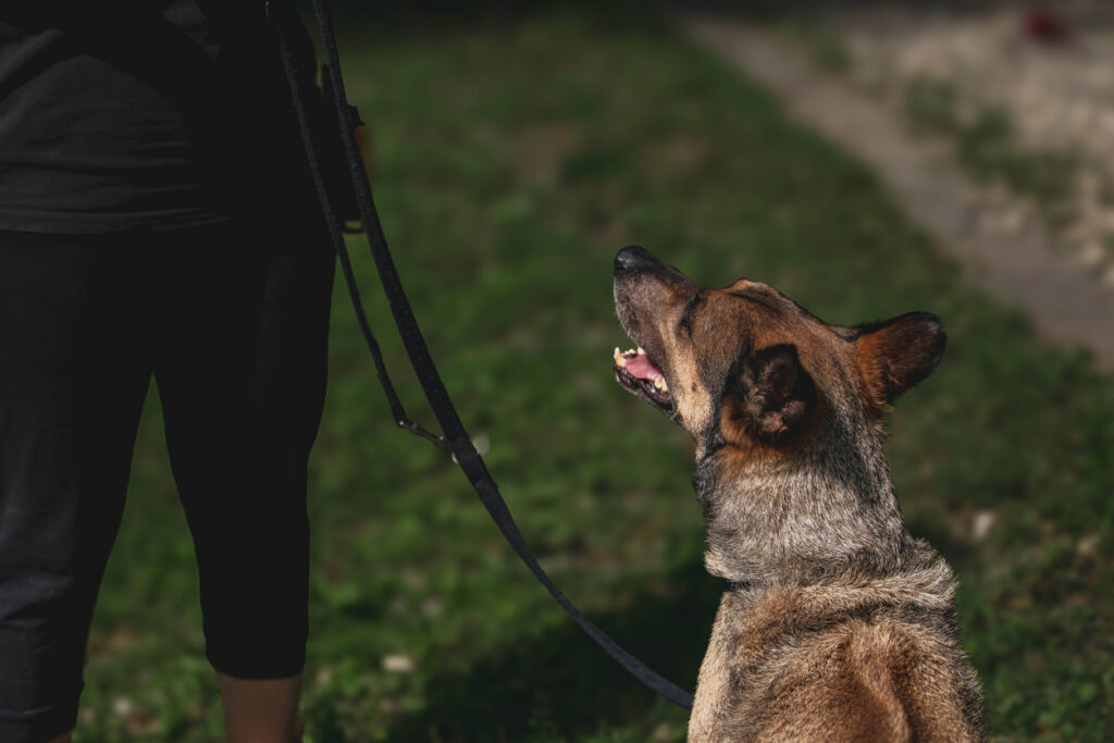 Protective behaviour is directed at the perceived threat—the dog positions themselves between you and whatever they’re concerned about, facing outward. Controlling behaviour often involves the dog focusing on you as much as the perceived threat. They’ll physically block you, make body contact, or even nip at you to prevent movement. The dog is treating you like something that needs controlling rather than something that needs protecting.