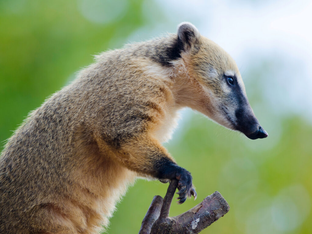 There are four coati species, with the white-nosed and South American coatis being the most common. Despite being raccoon relatives, their behaviour and appearance are distinct enough that most people wouldn’t make the connection without being told. The long snout is the real giveaway that sets them apart.