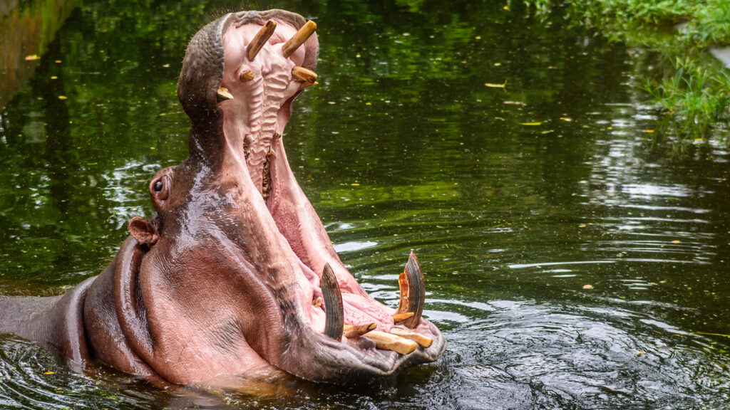 Male hippos can weigh over 1,800 kilograms and despite their bulky appearance, they can run up to 30 kilometres per hour in short bursts, easily outpacing humans. They have enormous jaws with tusks that can grow up to 50 centimetres long, capable of biting a crocodile in half or crushing a canoe. Most attacks happen when people encounter hippos on land at night while the animals are grazing, or when boats get too close to pods in the water.