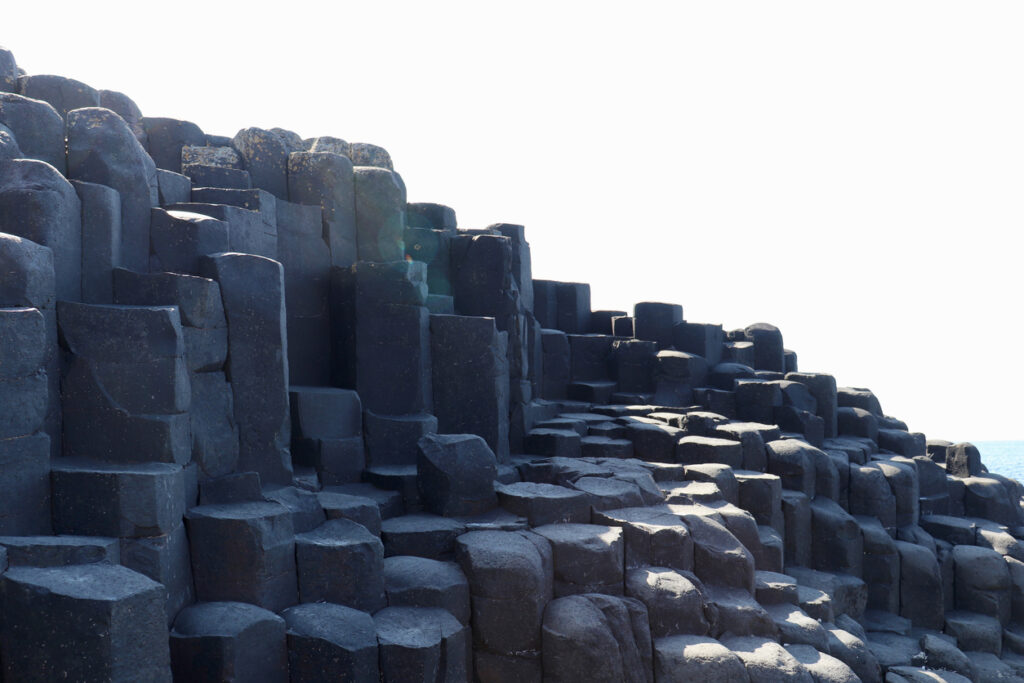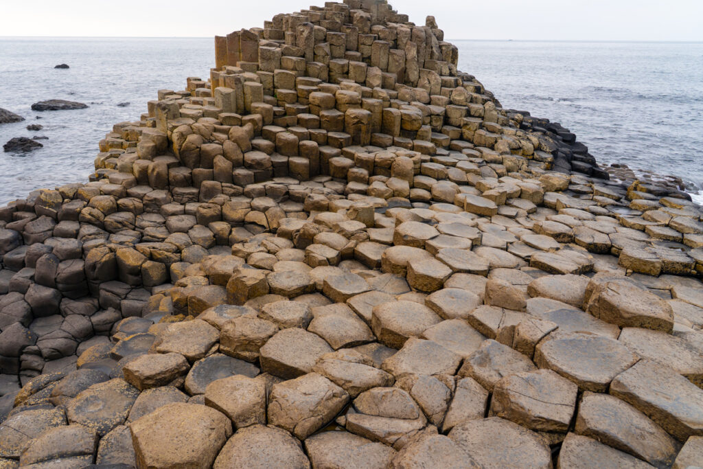 The tops of the columns form flat surfaces at different heights, creating a natural staircase that leads from the cliff down to the sea and then disappears underwater. Some columns are barely above ground level, others reach 12 metres high, and the varying heights make it look like someone deliberately arranged them as steps. The tallest column is called the Chimney Stack, and standing next to it feels like being next to a building rather than a rock formation.