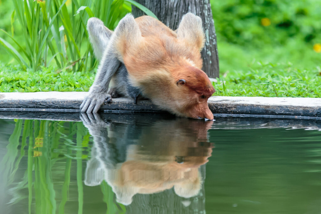Proboscis monkeys are surprisingly good swimmers, and that big nose might even help a bit by warming or filtering air when they come up for breath. While they use their limbs and tails for paddling, their nasal structure may help regulate air intake in and out of the water.